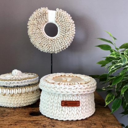 Pour créer de jolies boîte à bijoux de style balinais, il suffit ensuite de coller des coquillages cauris au pistolet à colle chaude sur le couvercle et de coudre coquillages et perles sur les côtés (voir photo)