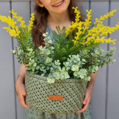 Les photos montrent la corbeille MILA en Bobbiny eucalyptus