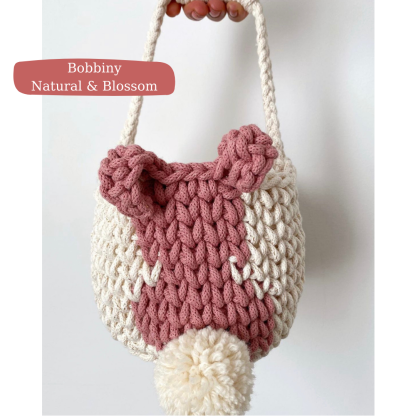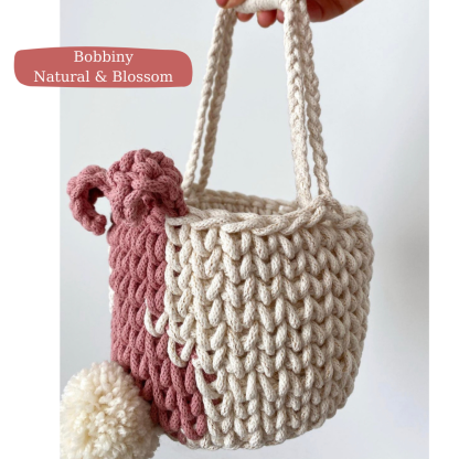 Les photos montrent le panier lapin en caramel et blossom mais vous aurez le choix de le crocheter dans de nombreux coloris du nuancier Bobbiny pour le coordonner à votre décoration de chambre.