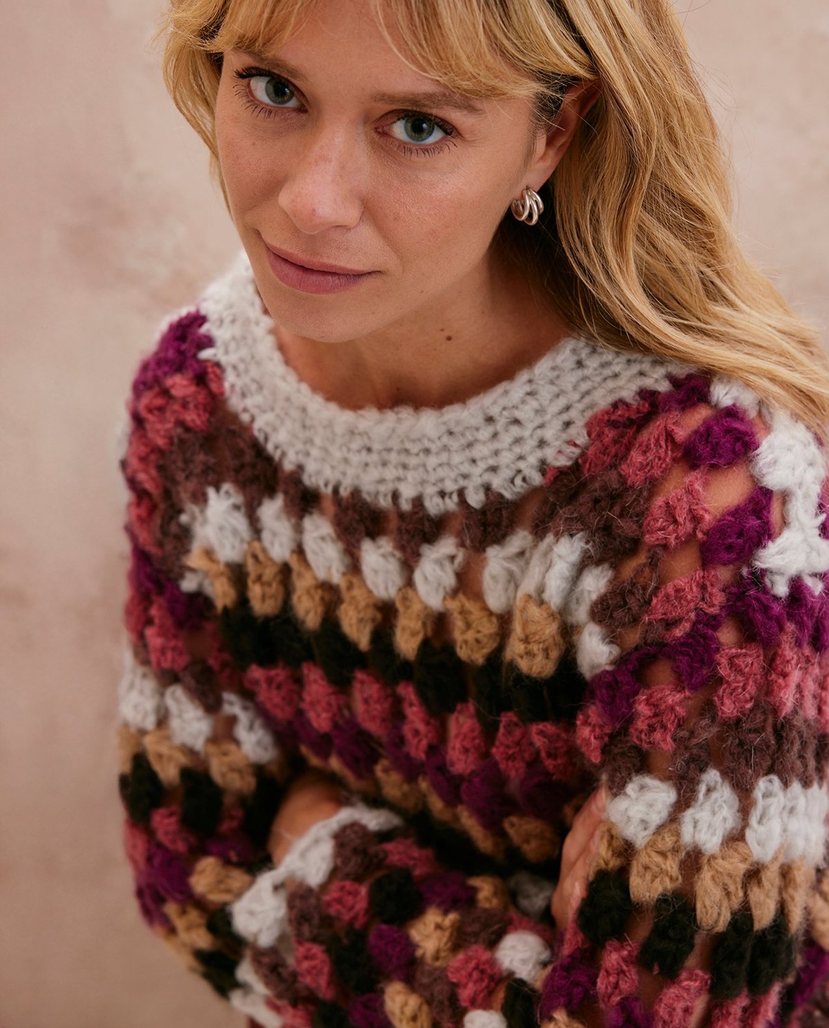 Avec ce patron crochet, vous allez pouvoir réaliser vous même facilement votre pull SONIA chez vous.