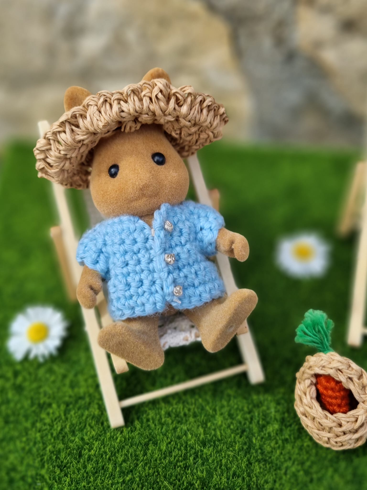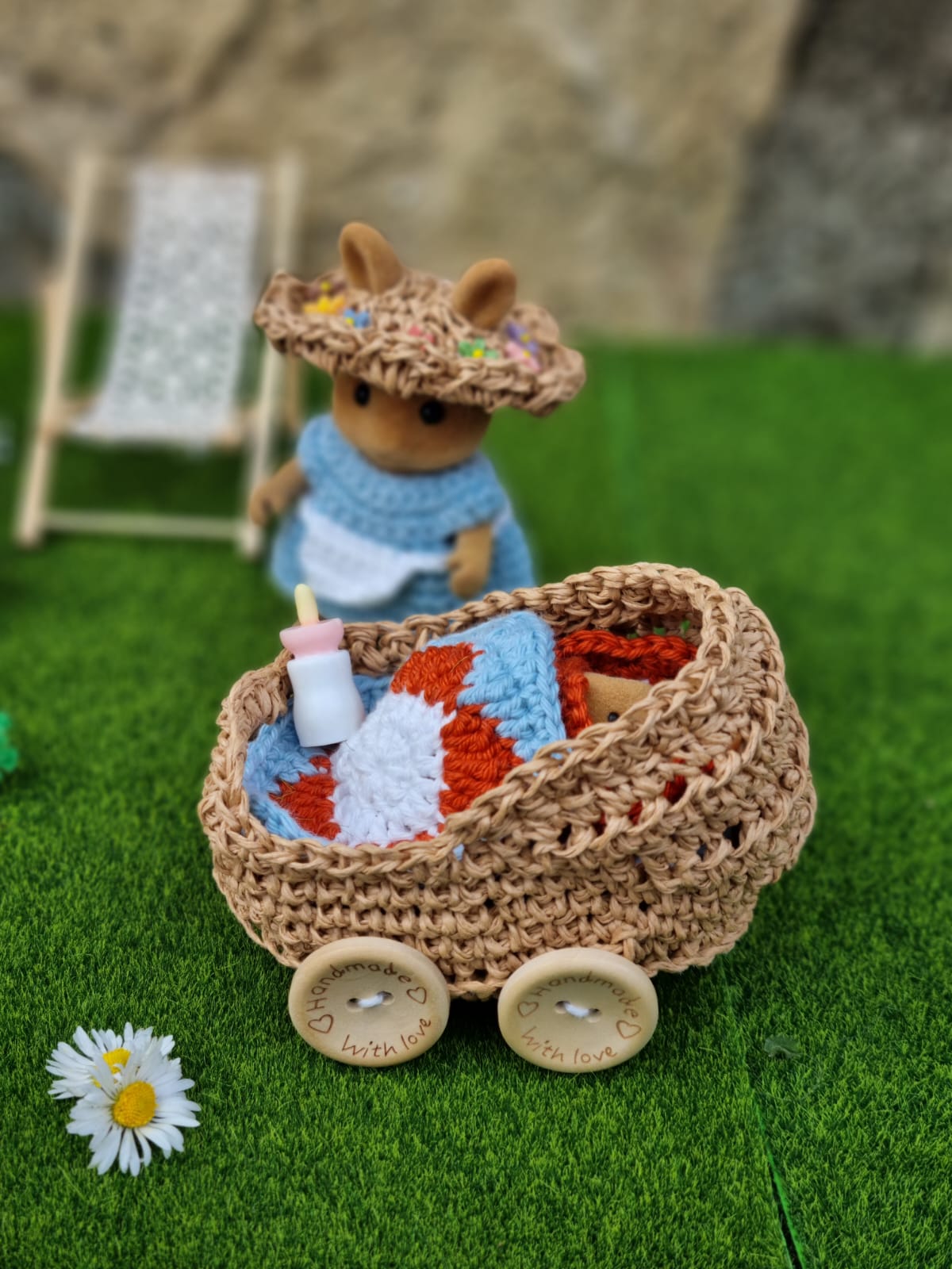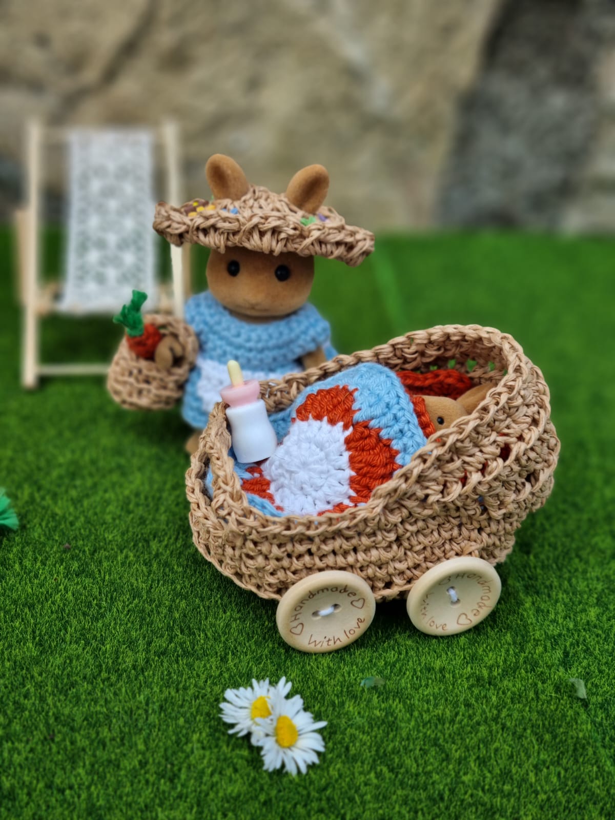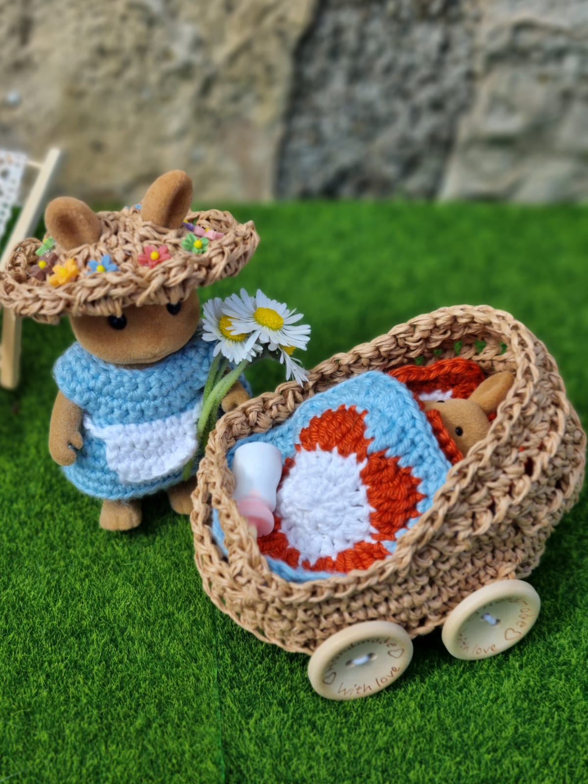 - le landau est garni d'un matelas, d'un oreiller et d'une couverture fleur en granny