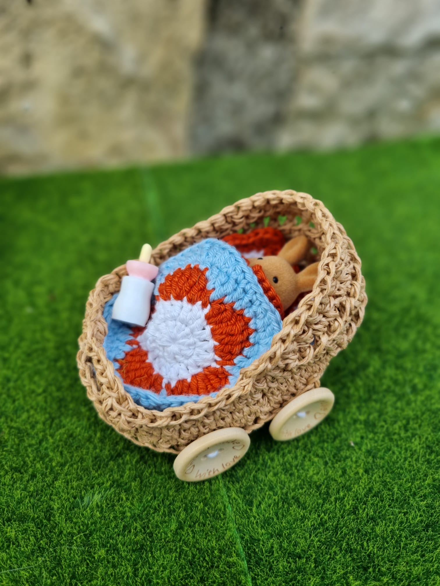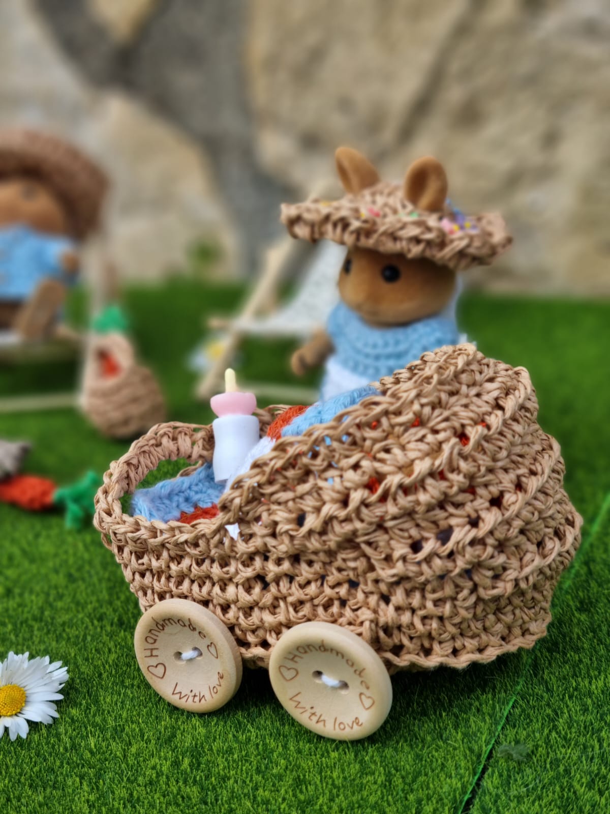 - Le landeau crocheté en raphia a 4 roues qui tournent vraiement