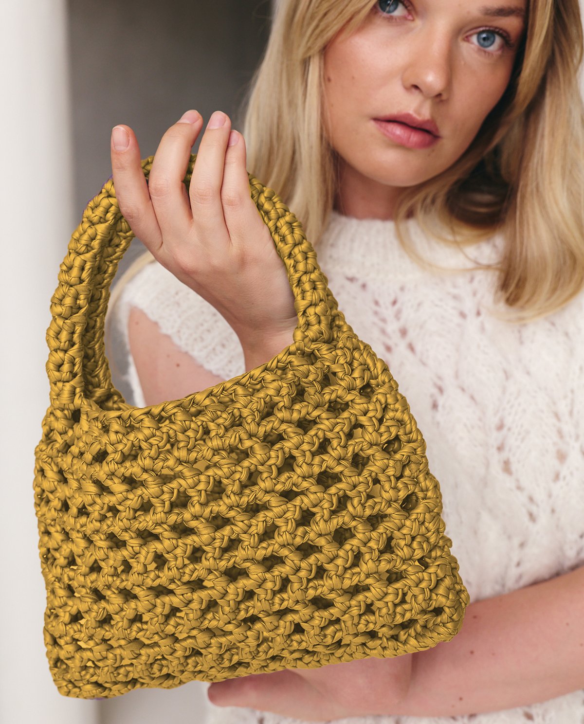Idéal pour l'été, ce sac Delphe se crochète en grille de brides en Pingo Maker Déco Gloss.