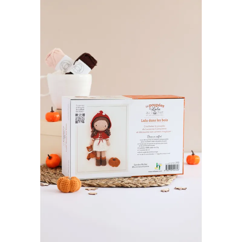 Dans ce coffret crochet, se trouve toutes les fournitures et explications pour crocheter une poupée inédite vêtue pour une promenade dans les bois : bottines et capeline. Une adorable poupée au crochet accompagnée de charmants accessoires d’automne : doudou écureuil et citrouille.