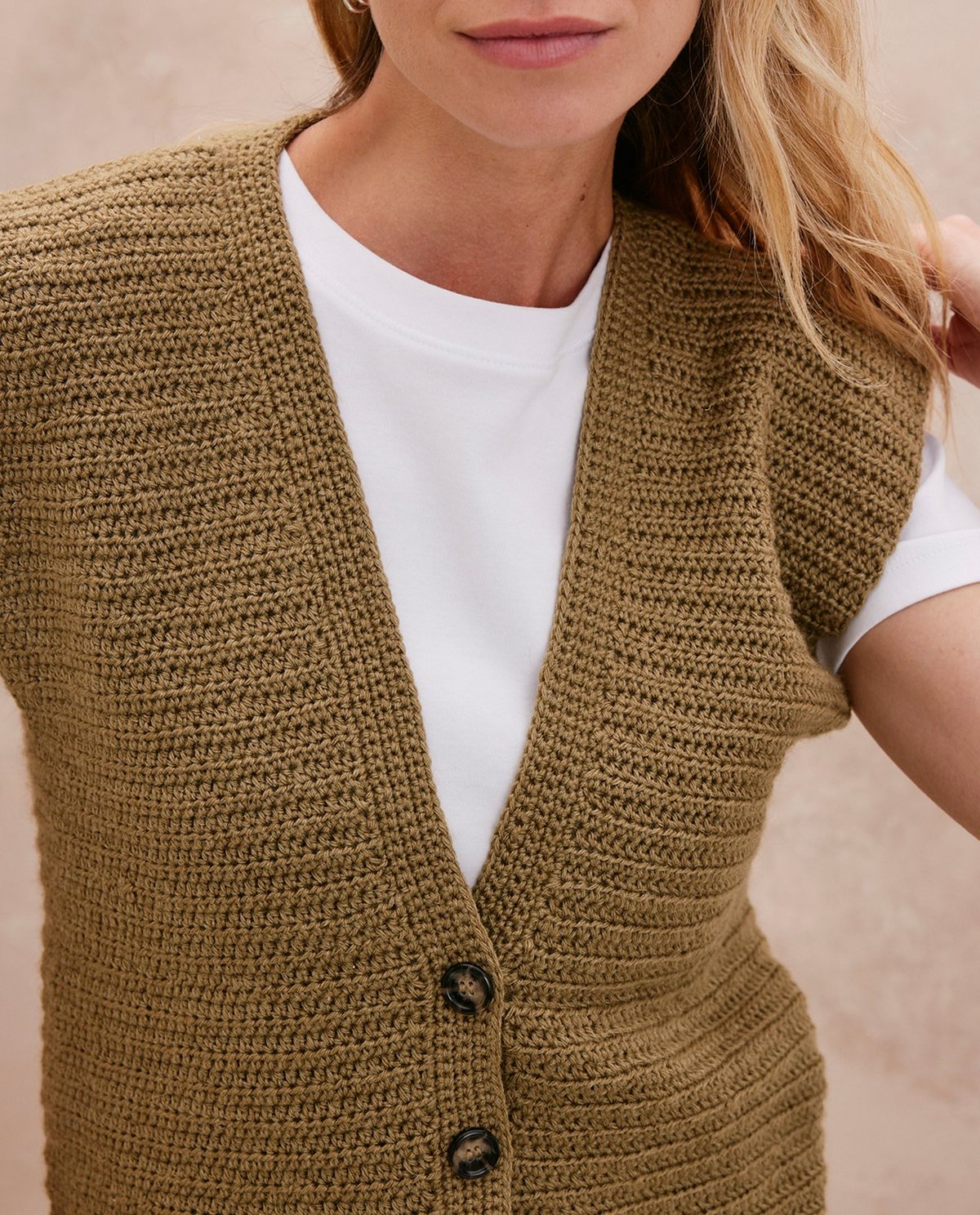 Parfait pour compléter vos tenues de mi-saison, ce gilet sans manches SACHA se crochète en Phil SOIE MÉRINOS.