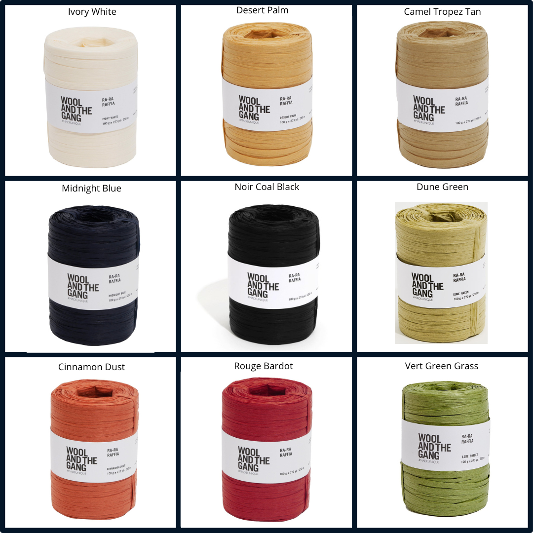 3 mini pelotes de raphia à crocheter Ra-Ra Raffia Wool And The Gang (desert palm, + rouge bardot + green grass ou desert palm + ivory white) disponible sur le site en 30g et 100g