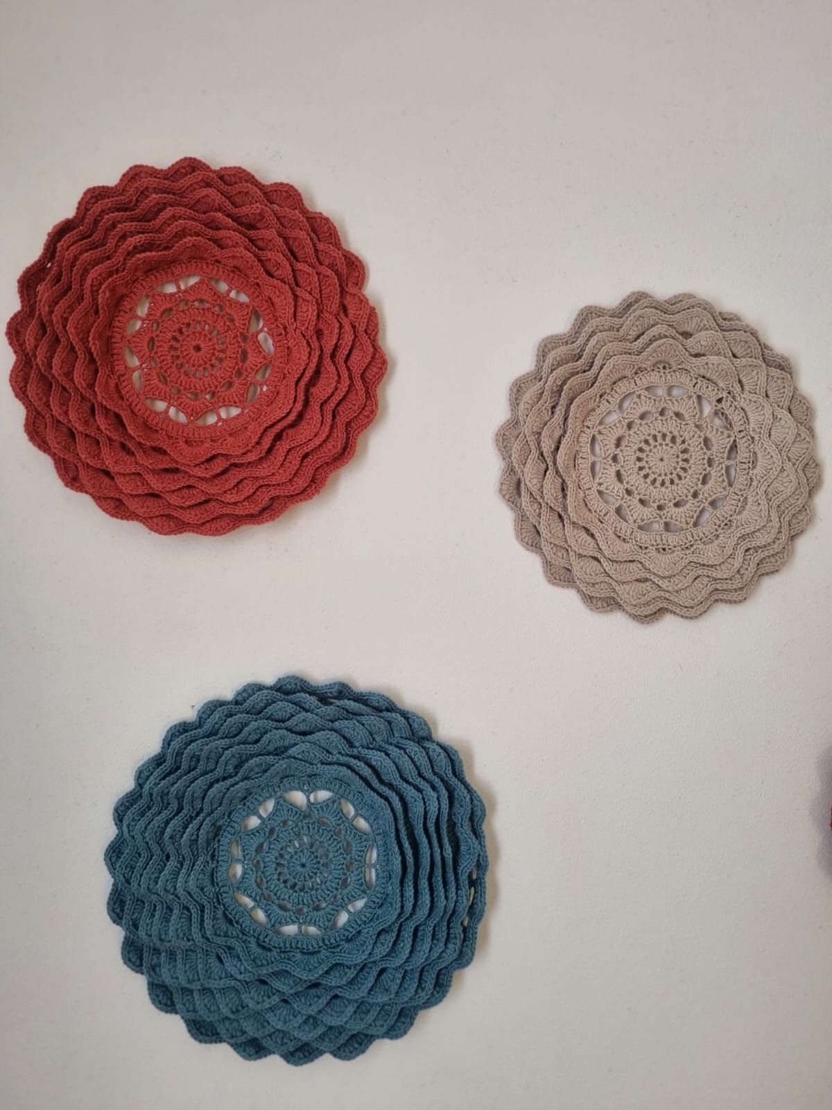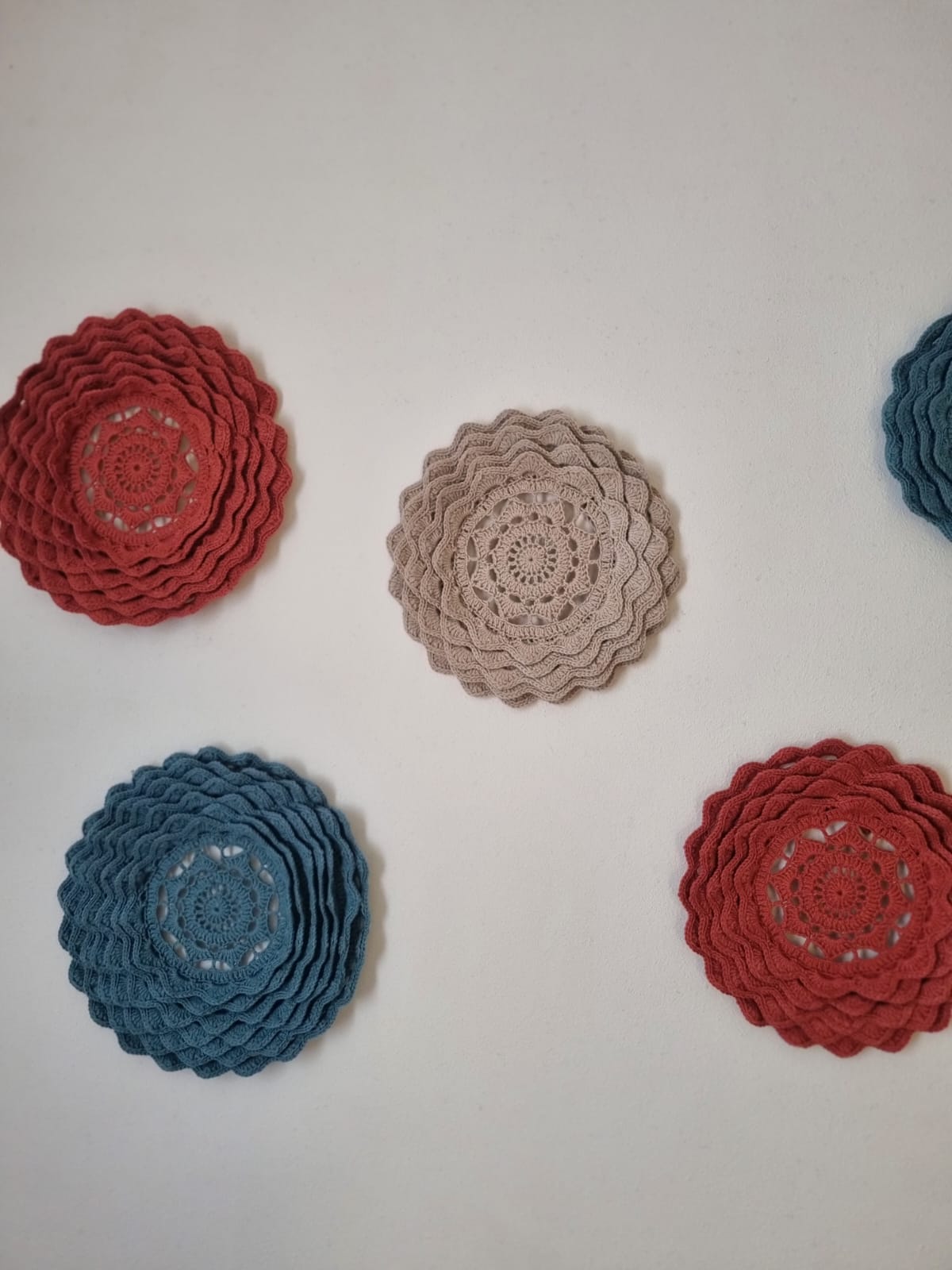 Nos fleurs sont crochetées en terracotta, prusse et sable