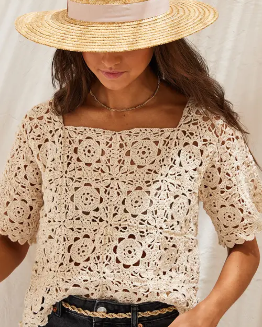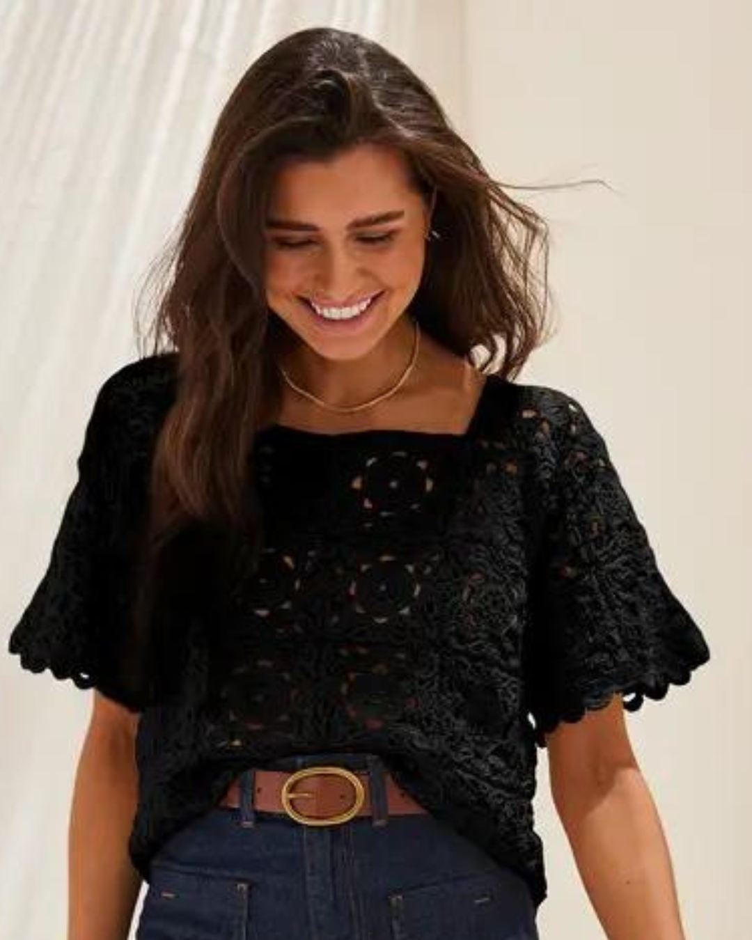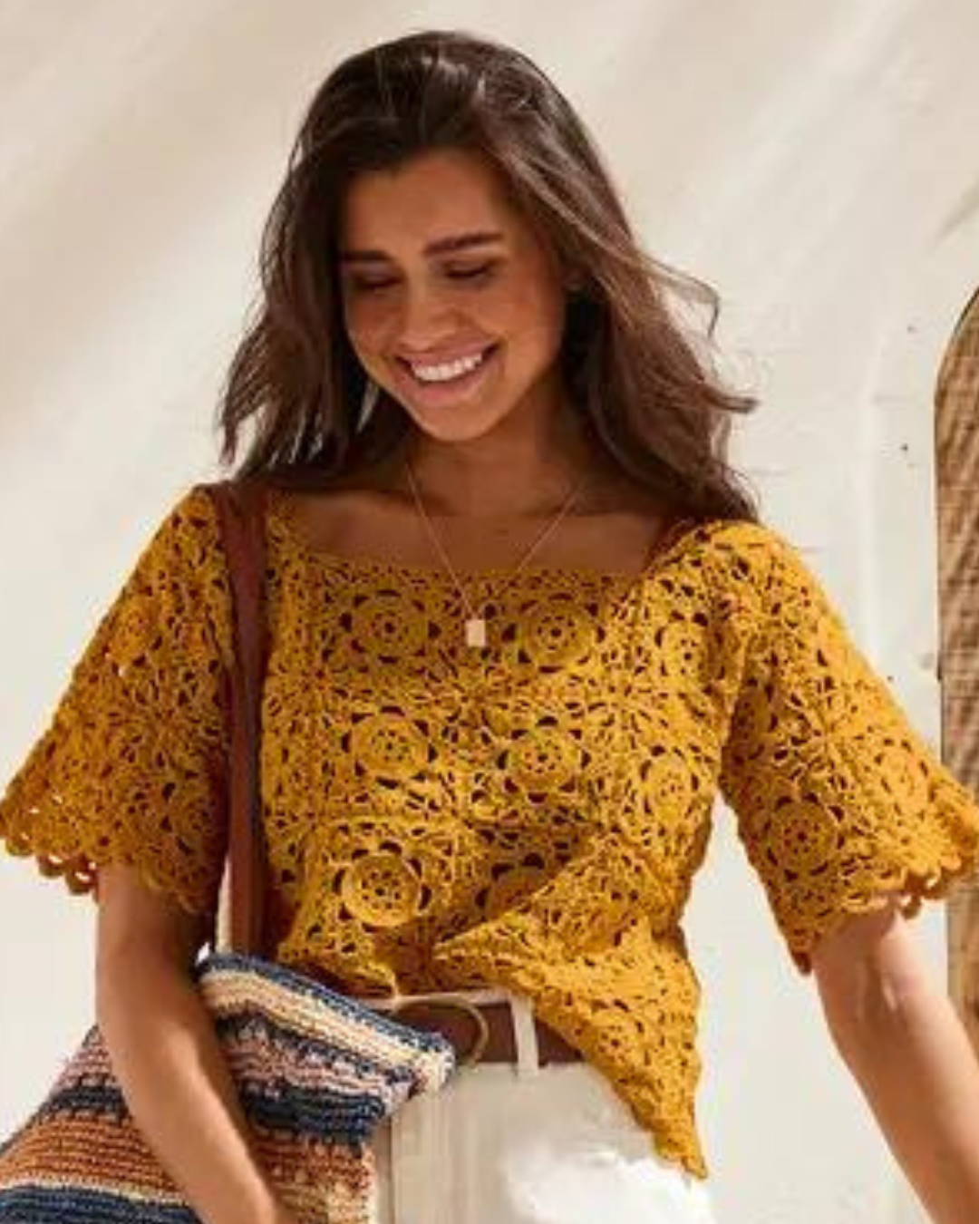 Votre crochet fait dans la dentelle et s’amuse avec les jeux d’ajourés et les carrés granny pour créer ce modèle de top ajouré à tricoter dans le fil fin spécial crochet pur coton d’Egypte PHIL PERLE 5 disponible en 20 coloris dans la mercerie.