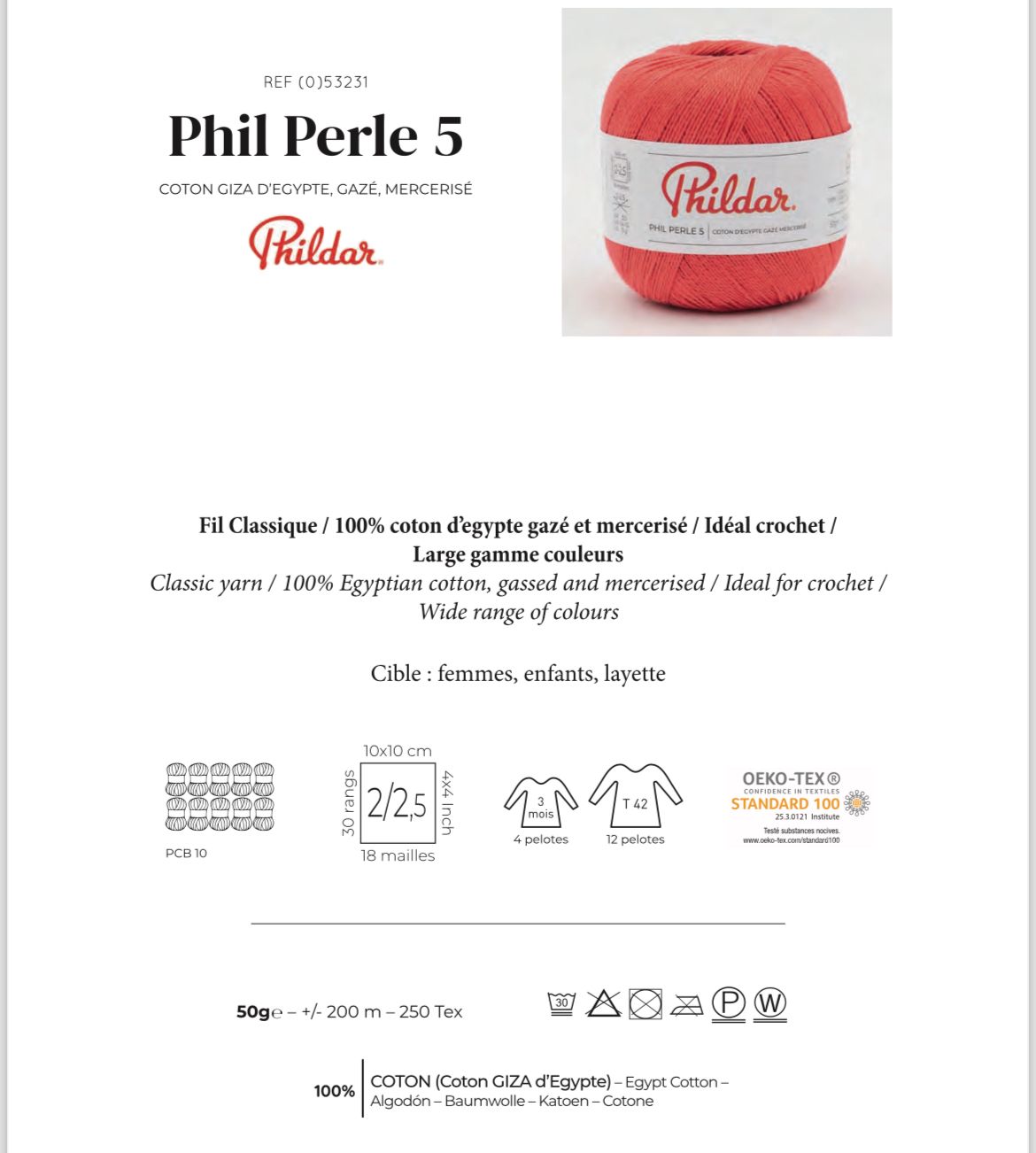 Notre PHIL PERLE 5 est un fil très fin 100% coton dEgypte gazé et mercerisé. Ce fil de grand métrage est fait pour les adeptes du crochet ! Sa large gamme de couleurs vous permettra de créer à l'infini toutes vos envies : vêtements, accessoires, et décorations en tout genre. Notre Phil Perle 5 est certifié OEKO-TEX.