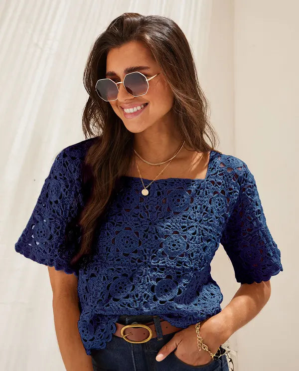 Votre crochet fait dans la dentelle et s’amuse avec les jeux d’ajourés et les carrés granny pour créer ce modèle de top ajouré à tricoter dans le fil fin spécial crochet pur coton d’Egypte PHIL PERLE 5.
